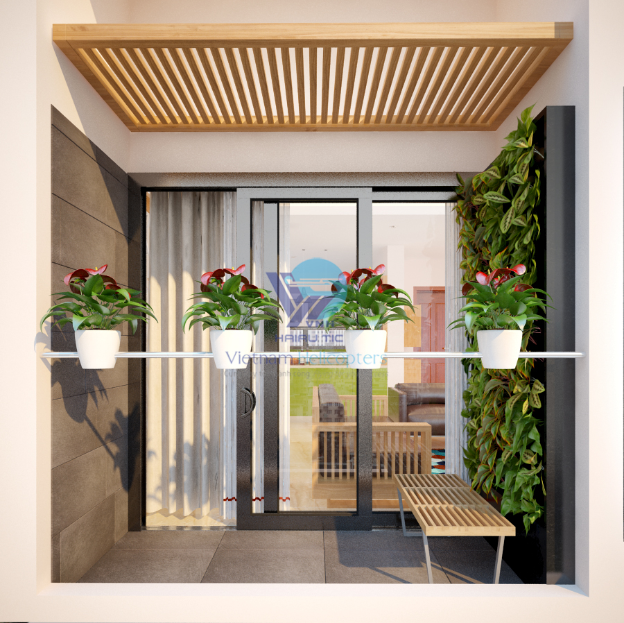 Một ban công nhỏ được thiết kế với hướng nhìn từ phòng khách tạo ra một không gian xanh dễ chịu cho gia đình.