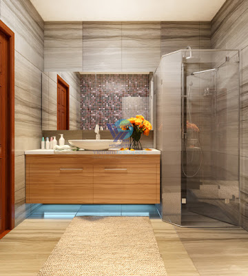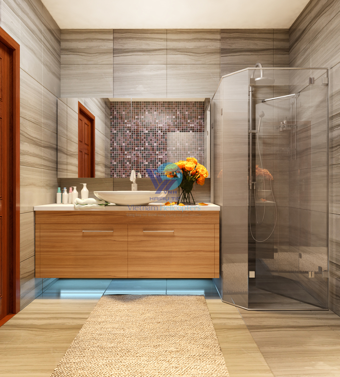 Phòng tắm sử dụng màu sắc hài hòa trong tổng thể căn nhà với ánh sáng và màu sắc dịu nhẹ.