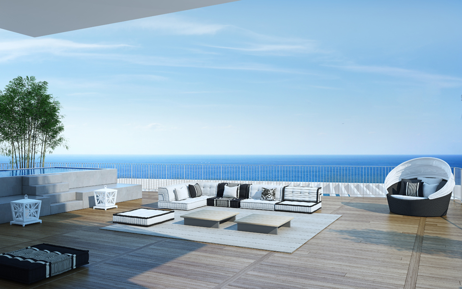 Căn penthouse có hồ bơi nước nóng nhìn ra biển, là nơi thư giãn tuyệt vời nhất sau những phút căng thẳng, mệt mỏi. Mọi không gian trong căn hộ đều được thiết kế mở, hòa hợp với thiên nhiên. Nội thất nhẹ nhàng, sang trọng và thẩm mỹ