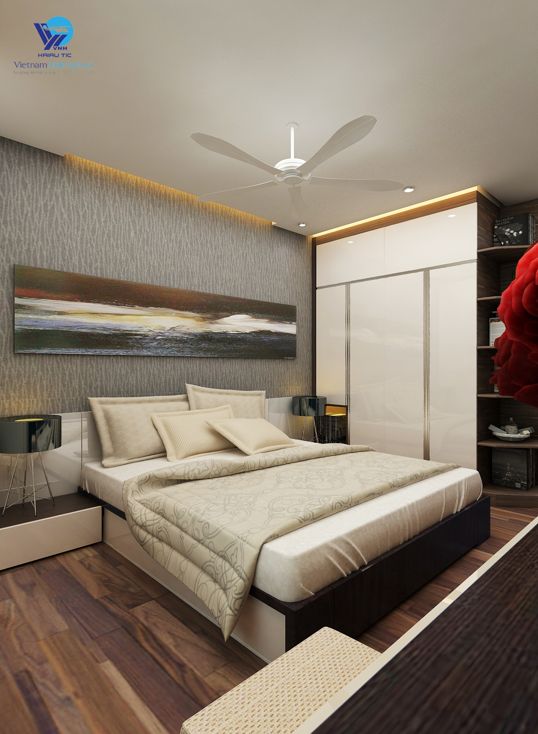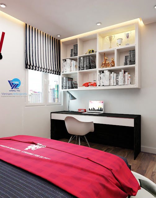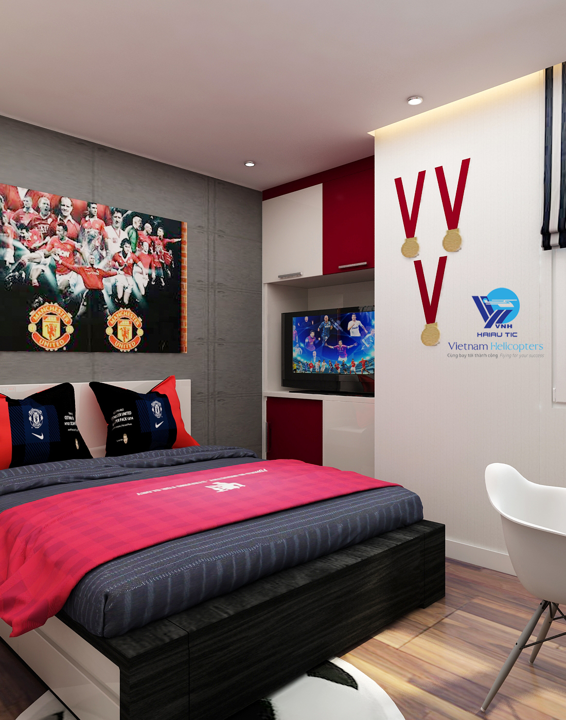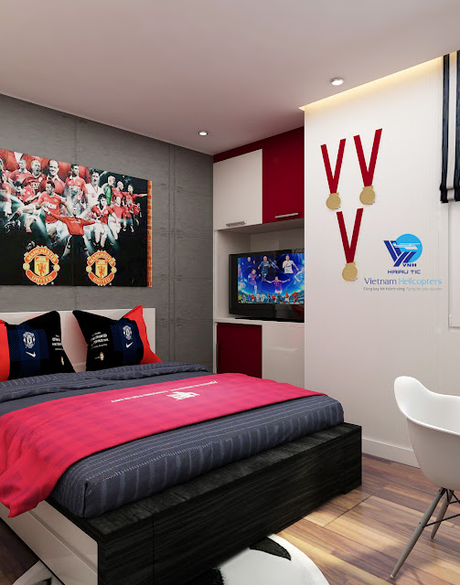Phòng ngủ được thiết kế phù hợp với sở thích của cậu con trai nPACIOLI Quý và kết hợp với đó là gam màu trầm ấm phù hợp với toàn bộ không gian của gia đình anh