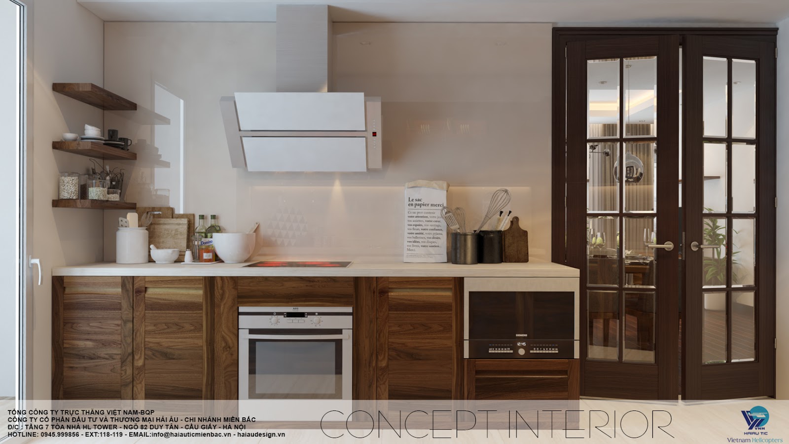 Phòng bếp được thiết kế hiện đại và ấm cúng nổi bật trong không gian nó là hệ thống đèn chùm tinh tế mang đến những bữa cơm ngọt trong gia đình của gia chủ.